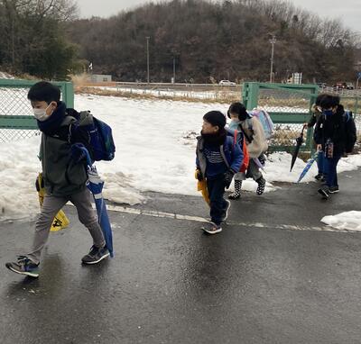 2023年2月13日 12時27分2月13日(月)、金曜日の大雪がだいぶ無くなりました。今日は雨の予報なので、傘を持っての登校です。「おはようございます!」