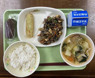 今日の給食は、「麦ご飯」「具だくさん味噌汁」「大豆とひじきの煮物」「ちくわの磯辺揚げ」「エクレア」「牛乳」でたっぷり美味しくいただきました。ごちそうさまでした!