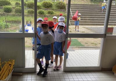 突然の雨で中断。校舎に帰ってきた子ども達です。びっくりしたね。
