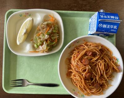 今日の給食は、私の中で本校No.1メニューの「スパゲティナポリタン」、それにぴったりの「シャキシャキサラダ」と「グレープフルーツ」、「牛乳」でした。今日もおいしくいただきました。ごちそうさまでした!