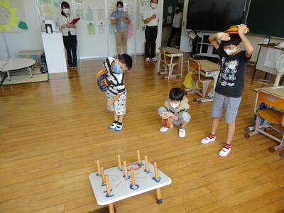 自分たちで輪投げゲームを行い、その様子を録画した動画で振り返りながら、優しい言葉について確かめる子どもたち。「先にやっていいよ」「真ん中を狙うといいよ」「がんばれ」などの言葉が、相手も自分も楽しくすることを改めて理解し、お楽しみ会への意欲をさらに高める様子がうかがえました。