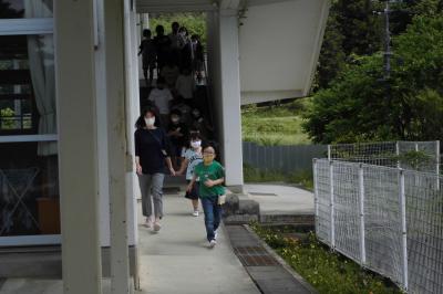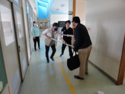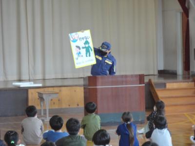 普段は校舎の出入口を全て施錠しているのですが、たまたまうっかり開いていた通用口から不審者が侵入してしまったという設定で、教職員による対応、子どもたちの避難の訓練をしました。大信駐在所の橋本さんの迫真の演技により、緊張感が自ずと高まり、一人一人が真剣に取り組むことができました。