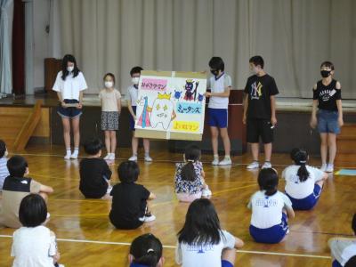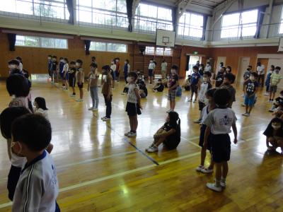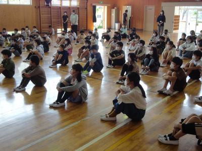 体育館での全体指導では、橋本さんの説明や呼びかけに「はいっ!」と返事をしながら、目と耳と心で話を聞く子どもたち。とても充実した時間となりました。