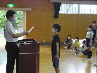 保健委員会が考えた今年度のむし歯予防のキャラクターは、「よいはマン」と「みがきウーマン」。この2人と力を合わせてお口の悪玉「ミュータンズ」をやっつけましょうと、それぞれのプロフィールも交えながら紹介してくれました。その後のよい歯の表彰では、むし歯のない人とむし歯を治した人を合わせた53名に、賞状とメダルが贈られました。