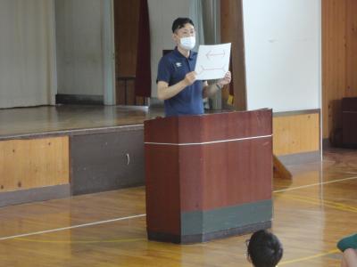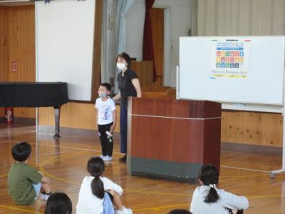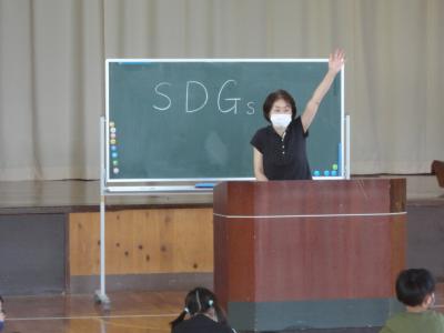 全校集会で、教務主任の先生が「SDGs(エスディージーズ)」の話をしました。