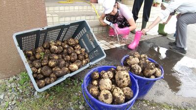 用務員さんの協力を得ながら、学校の畑で育ててきたじゃがいもたち。ひまわり学級のみんなで掘り起こしたところ、粒ぞろいの立派なジャガイモが出るわ、出るわ、出るわ!子どもたちも大喜びでした。
