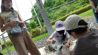 中学年は現在ヤゴのジェットすいしんにチャレンジ中。ペットボトルに水を入れ、そこに空気を注入してロケット発射させています。