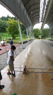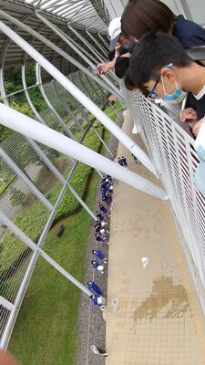 テラスでは、岩瀬中学校の皆さんが実験をしていました。紙で作ったパラシュートに生卵を入れ、地上に着地させていました。見た目に、コピー用紙一枚で作られているので、割れないはずがないのに、ひび一つも入らないグループもありました。素晴らしい実験を見せていただきました。