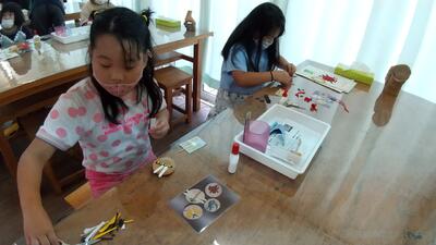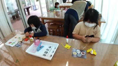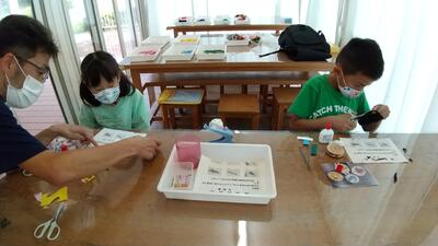 低学年は今、虫をデザインしたマグネット作りをしています。豊富な材料コーナーを活用させていただき、蝶やトンボなどを作っています。
