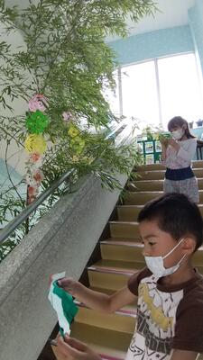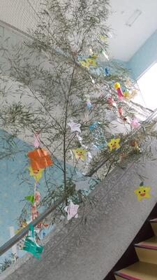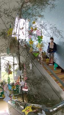竹を搬入してから、まだ3日目ですが、1階から3階までの階段の吹き抜け部分には、季節感漂う最高の癒やし空間ができました。友達の願い事を見ては、「叶うといいね、がんばれ」などと、声をかけ合っている姿も、心温まる姿です。
