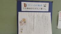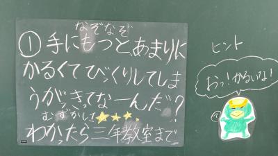 3年生の愛莉さんが係活動で行っている「なぞなぞコーナー」です。2年生の女の子たちと、ヒントを手がかりに相談しましたが、なかなか難しい…。でも、「あ~でもない、こ~でもない」と知恵を出し合う時間の楽しかったこと!!愛莉さんの活動が、会話のタネとなり、人と人とのコミュニケーションの機会を生んでくれました。素晴らしい係活動だと思います。3年生は、交流学習以外は1人の学級です。「一人だから人とふれ合うことはできない」と考えるのではなく、「一人だからこそ他の学年との交流ができる」というように、発想をプラスに転換した活動になっていて、とてもうれしく思いました。そして、愛莉さんのこの活動を支えている担任の教育愛を感じました。