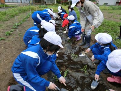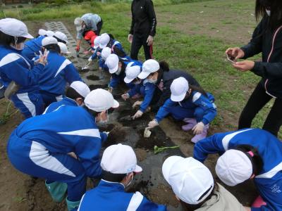 学校の畑で、栽培活動がスタートしました。一足先に種付けをしたジャガイモはしっかりと育ち、芽から多くの葉がでていました。今回は、そのとなりに、さつまいもの苗付けをしました。