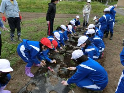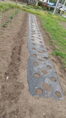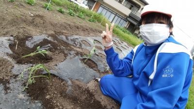子どもたちの充実した楽しい栽培活動(本番2割)の陰には、準備がありました。この活動の担当教員の綿密な計画と担任の事前指導。本校用務員の畑の準備とマルチ張り。特に、マルチは、子どもたちが作業しやすいように市販のものではなく、手作業でビニルに穴を空けていただいてあります(お椀を使って、一つ一つ丁寧に空けてくださったそうです)。本校教職員の強い連携による協働的実践力が「準備8割」となり、子どもたちの栽培活動の充実「本番2割」となって表れているのです。