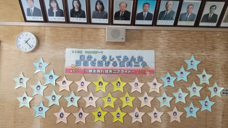 そのためのテーマを校長室に掲示しました。そして、本校のオリジナルマーク「キララ」に込められた願い(きらきら輝く笑顔と挨拶がこだまする信夫二小・自然あるれる信夫二小)が、35名一人一人の子どもたちにつながるように願って掲示物を作成しました。