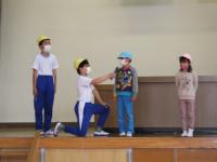 なかよしスタートの会で決めた「だるまさんがころんだ」や「ふやしおに」などの遊びをなかよしチームごとに行った後、全校生で「貨物列車」で遊びました。まだ始まったばかりで、学校に不安を感じている1年生に、進んでやさしく接し、分からないことは親切に教えようとする上級生の姿が多くありました。だから、1年生は大満足。1年生の二人のきらきら輝く笑顔は、マスクをかけていても十分に分かるほどでした。