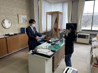 式の中で、6年生から国旗・市旗・校旗、無事故掲示板、ボランティア清掃雑巾が