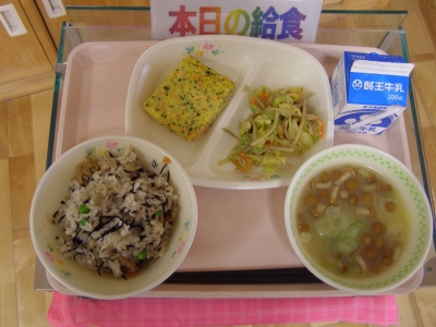 ひじきごはん  厚焼きたまご  ごぼうサラダ  なめこ汁  牛乳