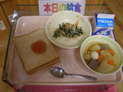 小麦胚芽パン ももジャム 洋風おでん ほうれん草のアーモンド和え 牛乳