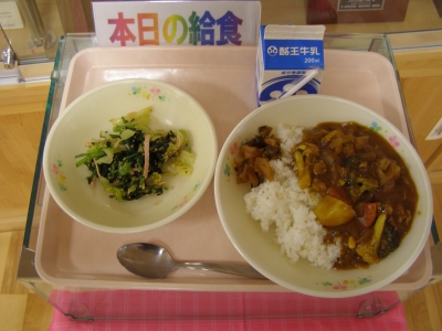 今日の給食 2014年1月23日 09時15分 今日の出来事 今日の給食は、麦ごはん 冬野菜のカレー 春菊のごま和え 牛乳やっぱり、カレーはとても人気でした。春菊のごま和えは苦味もあまりなく、子どもたちは「おいしい」と言って食べていました。