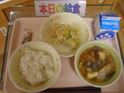 今日の給食 2014年1月20日 17時06分 今日の出来事 今日の給食は、麦ごはん さかなのふりかけ 生揚げのそぼろ煮 ツナサラダ 牛乳今日は、体が温まる煮ものでした。ツナサラダは、おいしいと言って食べていました。