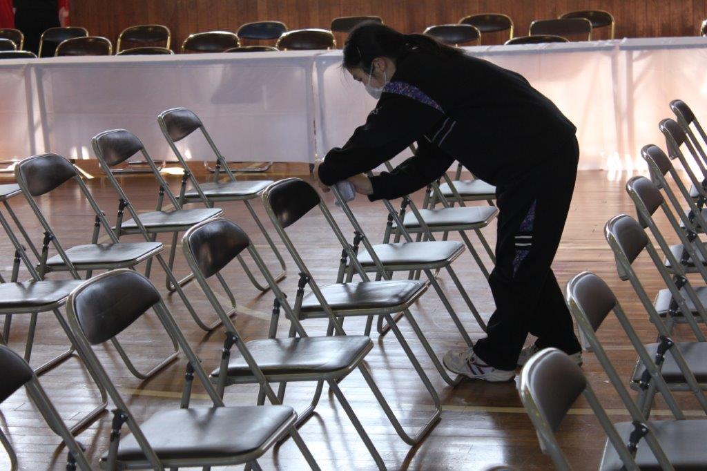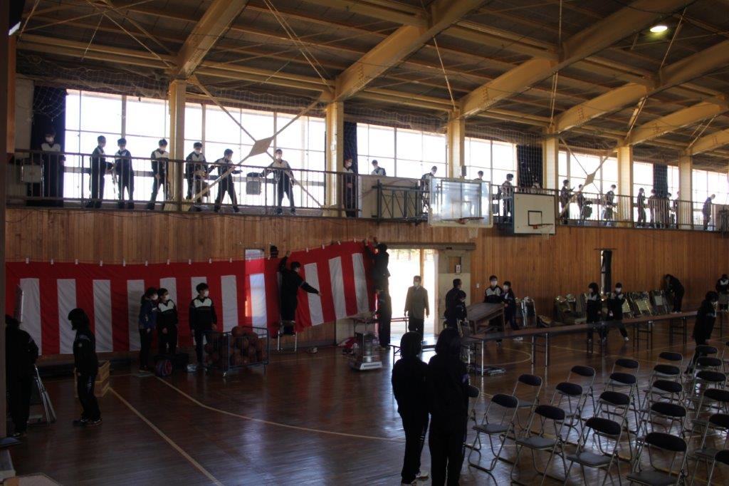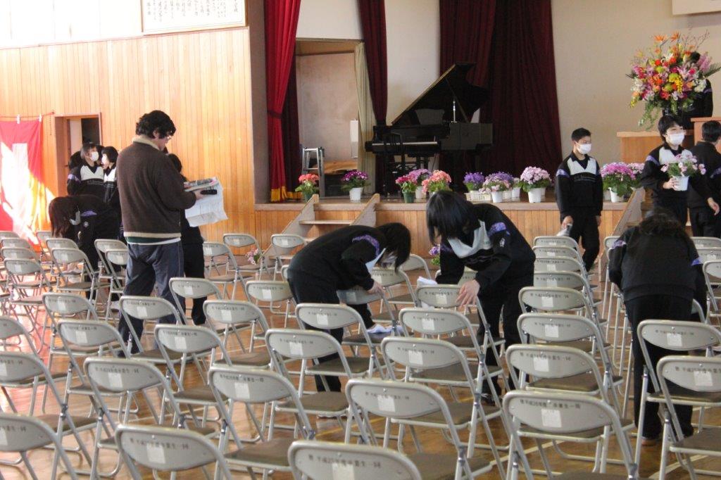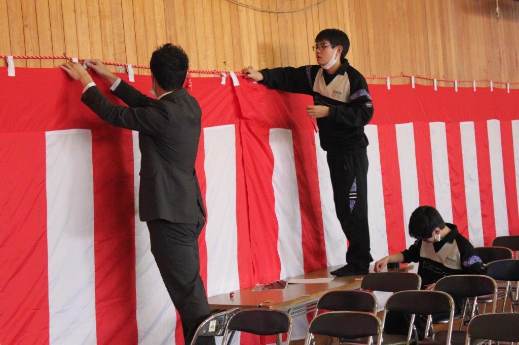 式場のは椅子は心を込めて 紅白幕の貼り付けは生徒と協力して みんなで取り組めば作業も速い