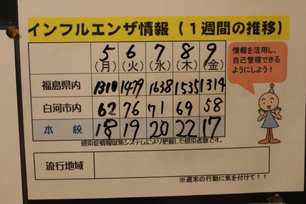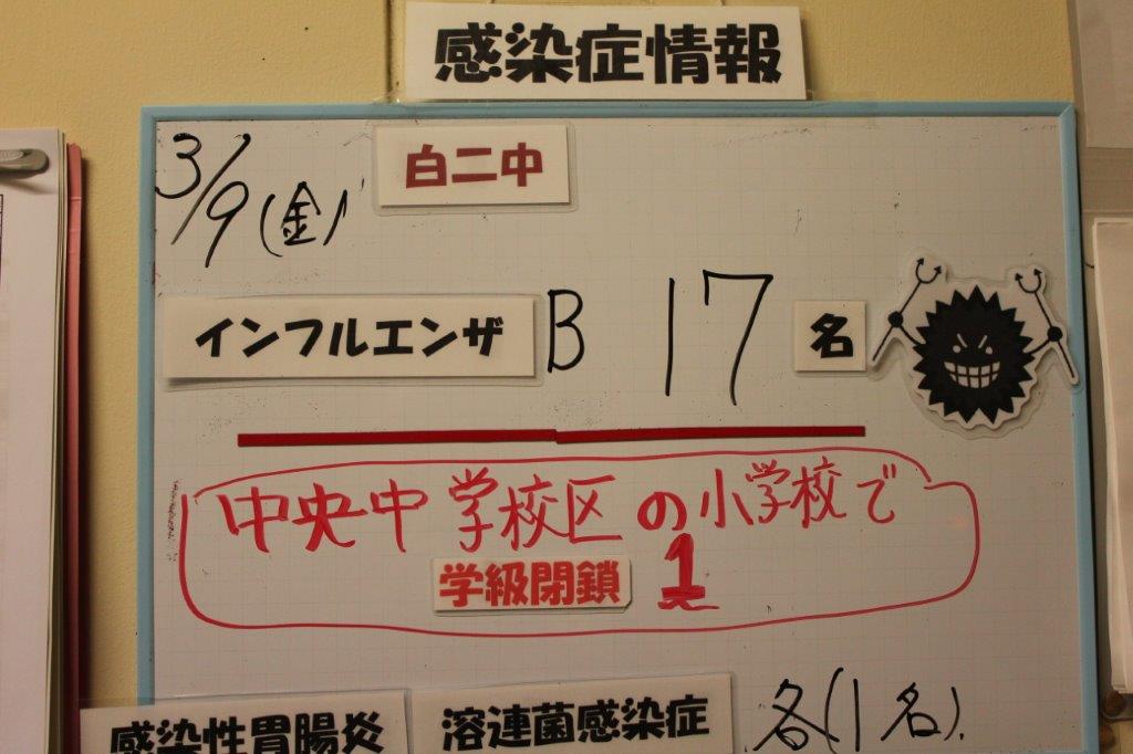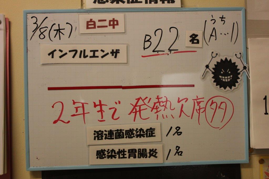 本日の罹患者は17名です。今週初めからインフルエンザ罹患者が急増し、Ⅱ期選抜を心配しましたが、高校の適切な対応により全員受験できました。来週には学校に復帰し、卒業式には3年生がきちんと参加できる模様です。しかし、1・2年の罹患者も少なくありません。生徒達は部活動があれば無理しても参加しようとします。これ以上増えて、卒業式が感染の場にならないようにするため、大会等の予定のない部活動は、この週末は休みしました。部活動はなくとも週末の行動によっては罹患の可能性は高まります。過ごし方を注意して下さい。