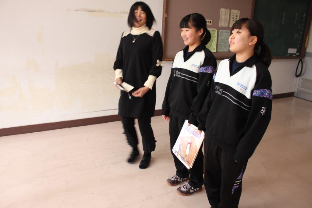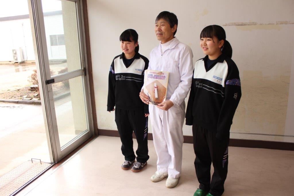 岩井さんと三村さん お礼状の手渡し センターの方と一緒に