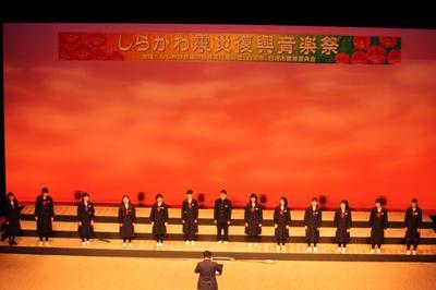 本日、コミネスで震災復興音楽祭が行われ本校合唱部が参加し、「ぜんぶ」と「ふるさと」の2曲を歌いました。3年生が引退し人数は少ないのですが、松本一先生指揮のもと、蕪木先生もステージに上がってきれいな歌声を響かせ観客を魅了しました。