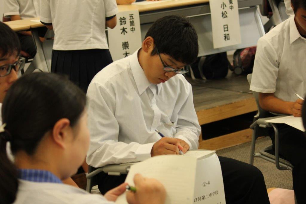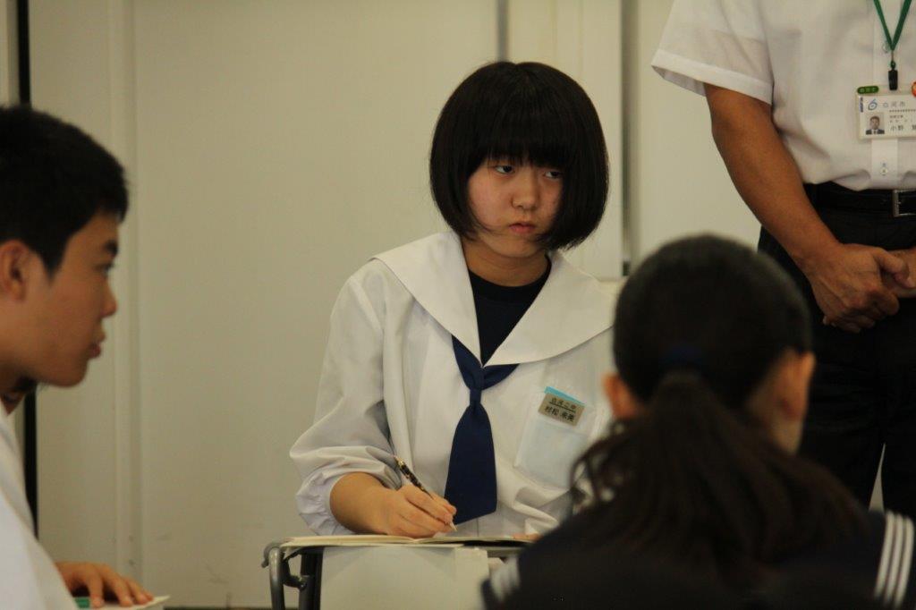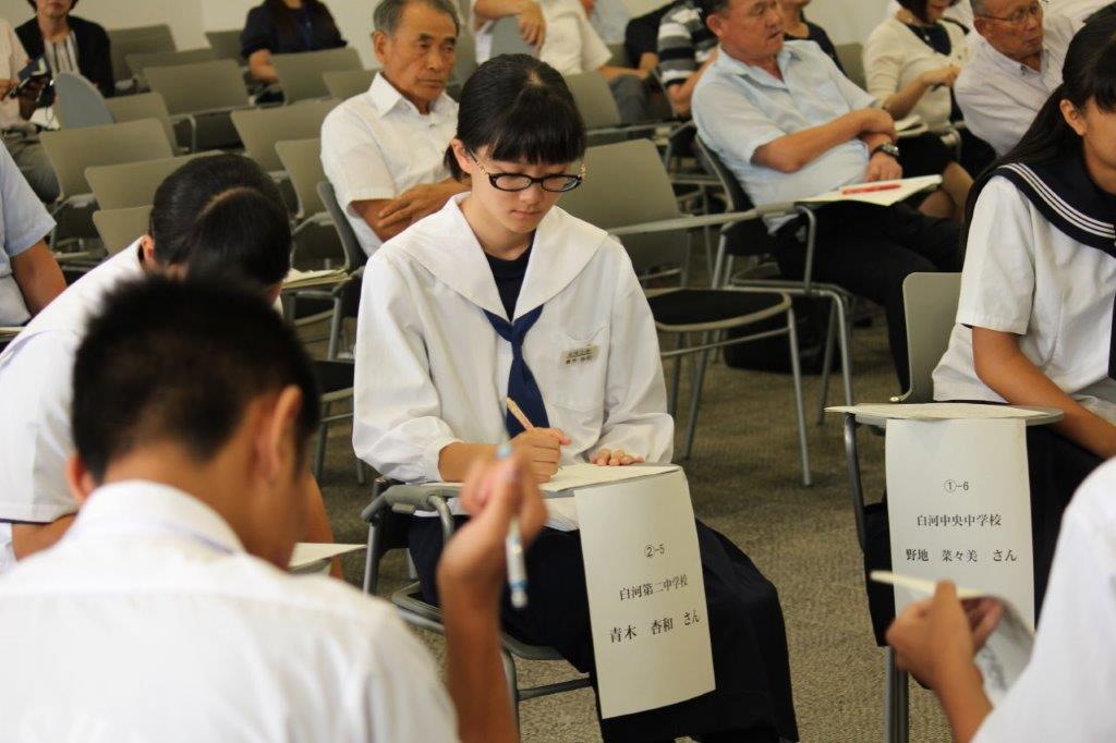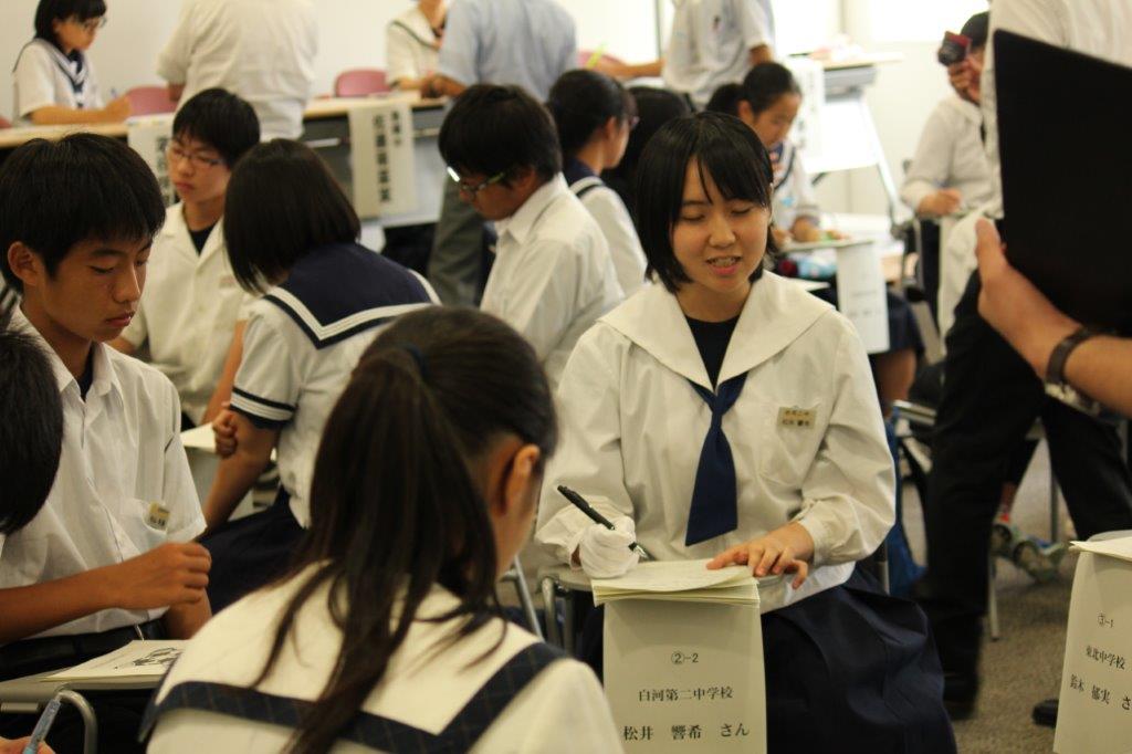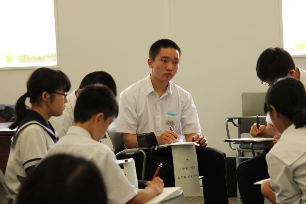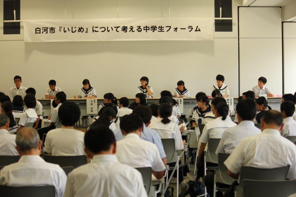 この行事は、市教委主催で市内8校の中学生代表が一堂に会していじめについて話し合いをするものです。