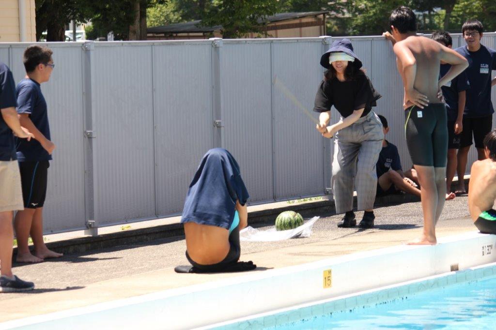 熱い日差しがふりそそぐプールサイドでは、スイカを巡っても挑戦が繰り広げられました。
