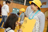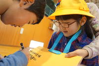 じゃんけんをし、1年生が勝ったら首からかけたボードにサインをもらいます。