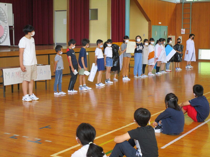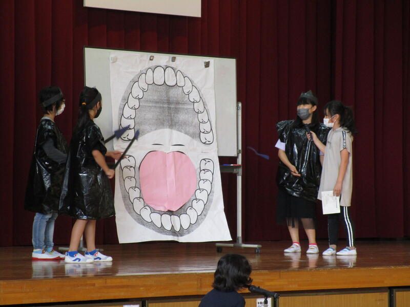 6月28日(月)に保健委員会が歯の健康集会を開きました。むし歯にならないためにはどうすればよいか、寸劇を取り入れて下級生にもわかりやすく教えてくれました。また、健康な歯の子どもたちの表彰も併せて行いました。