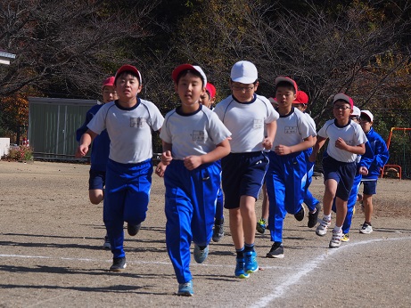 2017年11月10日 15時08分 11月9日(木)校内マラソン大会を実施致しました。風が強く、寒かったため、低中高のブロックごとの開催となりました。9月より朝や体育の時間に、校内マラソン大会のために練習をしてきた成果が各自自己ベストタイムを出すなどに表れていたようです。1・2年生は1000m、3・4年生は1500m、5・6年生は2000mの距離で競いました。5・6年生の2000mでは新記録が出ました。