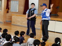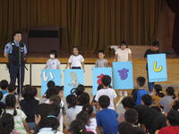 2019年6月26日 08時29分防犯教室を実施しました。駐在所の久田巡査さんと白河警察署スクールサポーターの小松さんを講師に招いて、不審者にあってしまったときの対応の仕方についてご指導いただきました。一人で遊んだり寂しいところを通ったりしないこと、「いかのおすし」を意識して生活することなどを確認しました。