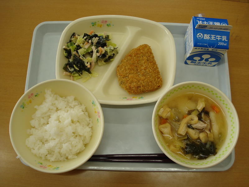 ごはん 牛乳 かぼちゃひき肉フライ キャベツのみそマヨあえ すいとん汁