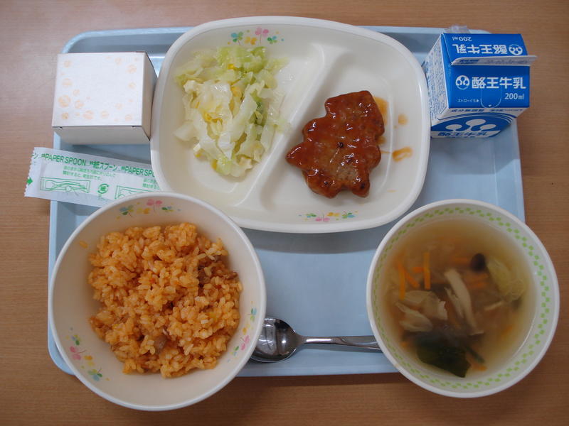 チキンライス 牛乳 もみの木ハンバーグデミグラスソースがけ お星さまサラダ ファイバースープ クリスマスデザート