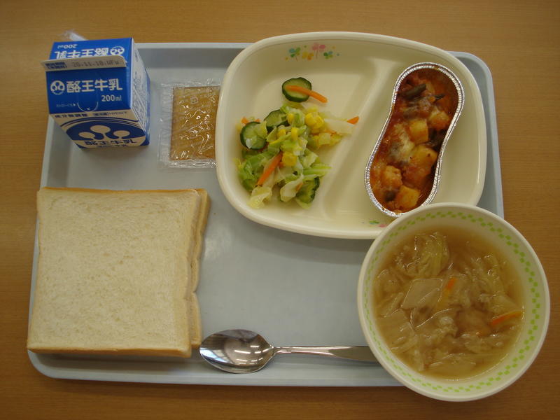 食パン 牛乳 りんごジャム ポテトミートグラタン コールスローサラダ 白菜と肉団子のスープ