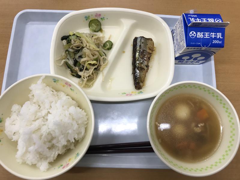 ごはん 牛乳 さんまのしょうが煮 もやしの香味あえ だまこ汁