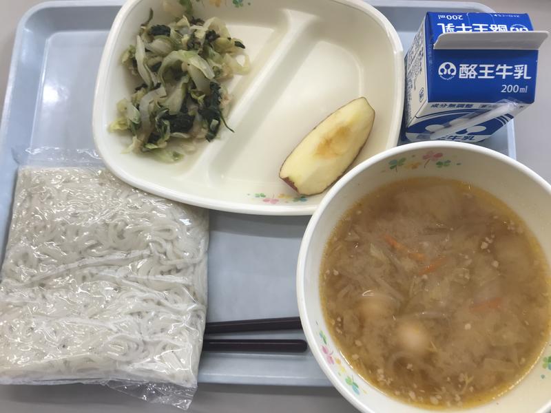 肉みそうどん 牛乳 キャベツのおかかあえ りんご