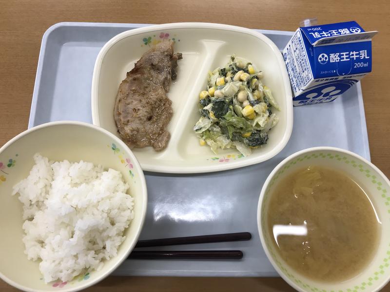ごはん 牛乳 豚肉のごま焼き ほうれん草のサラダ しみ豆腐のみそ汁
