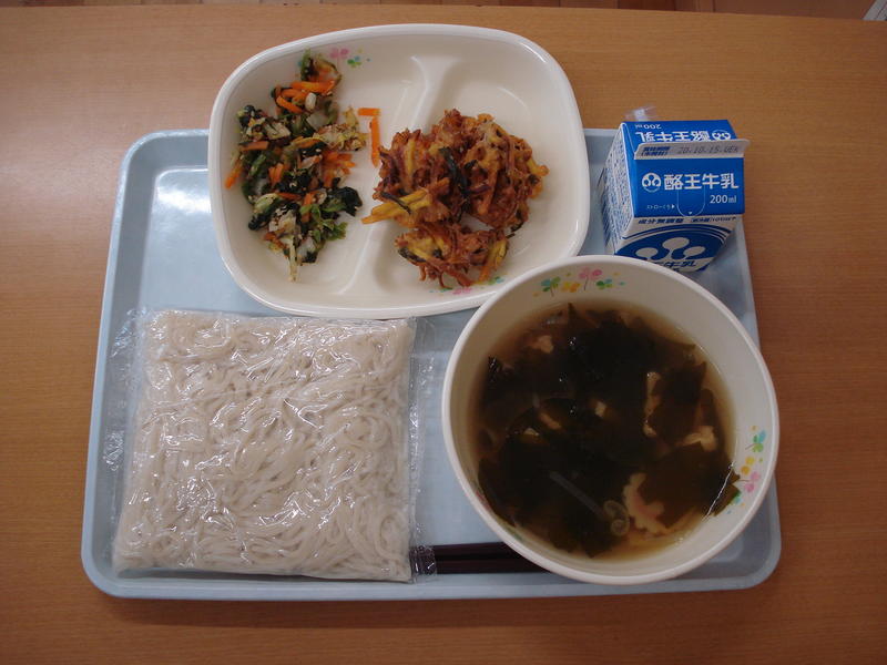 わかめうどん 牛乳 さつまいも入りかきあげ 白菜のおかかあえ