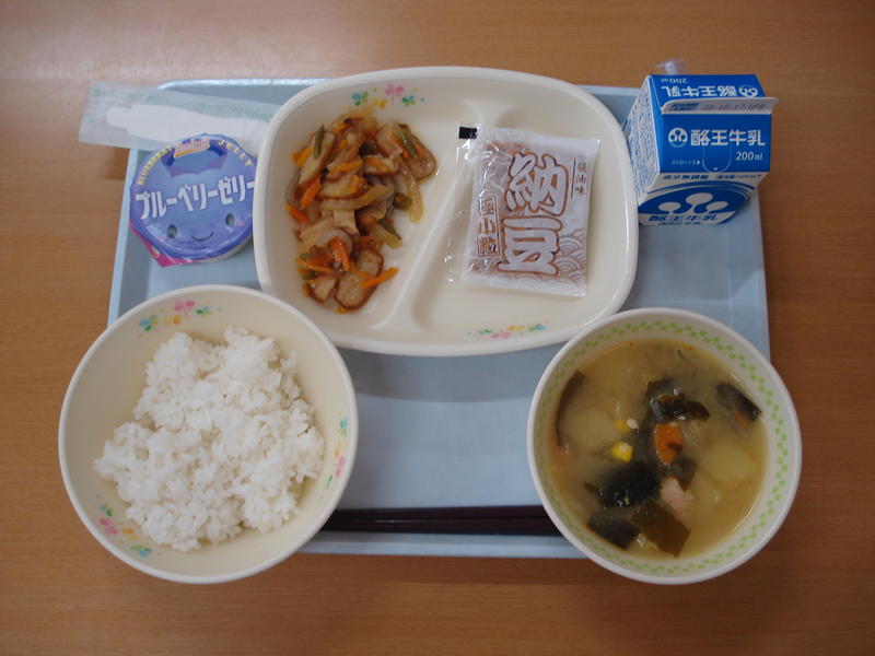 ごはん 牛乳 納豆 大根の炒り煮 どさんこ汁 ブルーベリーゼリー