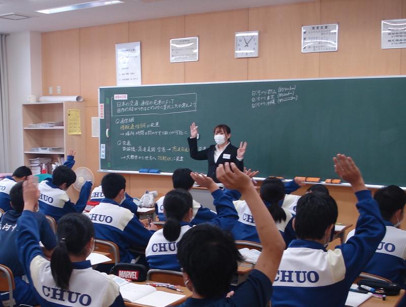「2週間の教育実習を通し、教員として必要な資質を磨くことができました。中央中の生徒達は積極的をしてくれる生徒や、いろいろな話をしに来てくれる生徒が多く、とても楽しく充実した2週間でした。皆さんの学校生活の中の大切な2週間に関われたことを嬉しく思います。」