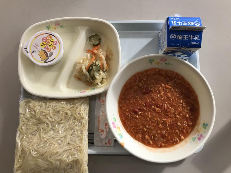 大豆ミートスパゲティ 牛乳 和風サラダ プリン