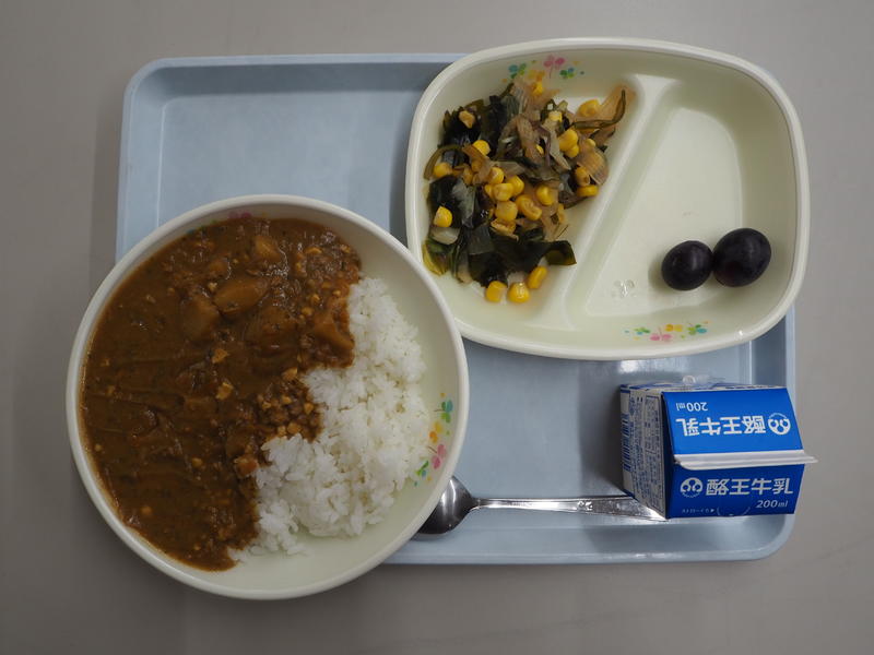キーマカレーライス 牛乳 海藻サラダ 巨峰