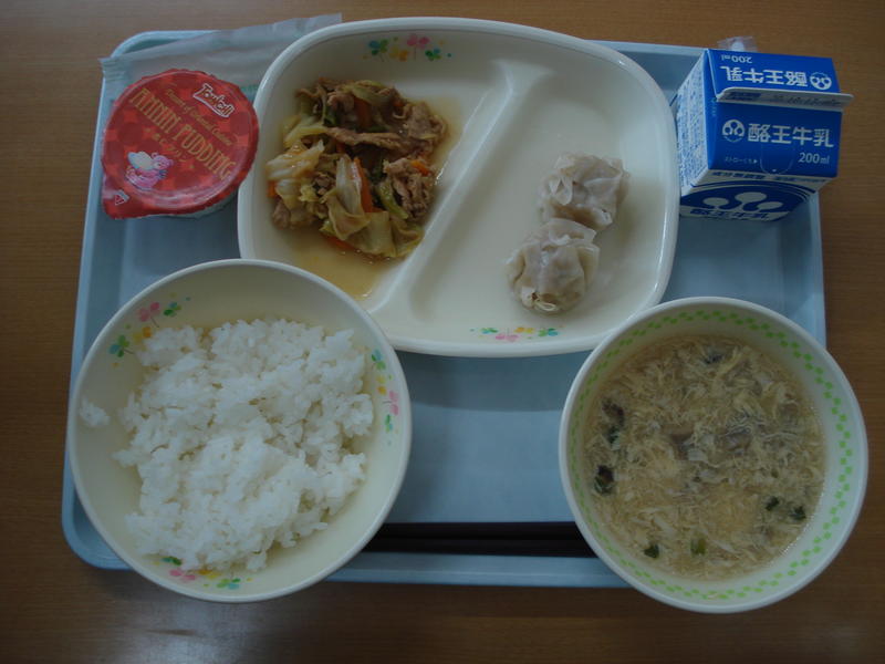 ごはん 牛乳 肉シューマイ ホイコーロー きのこの中華スープ 杏仁プリン