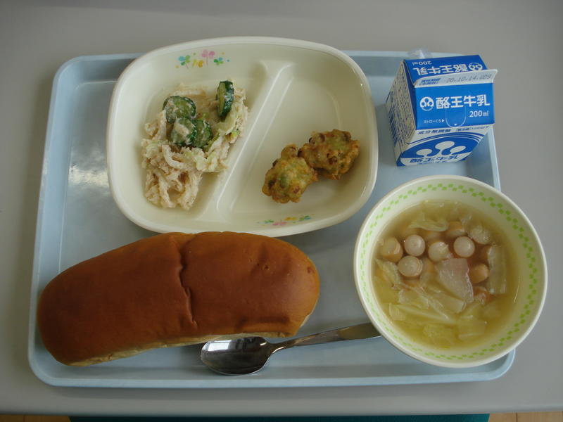 黒糖パン 牛乳 枝豆のフリッター チキンサラダ ポトフ