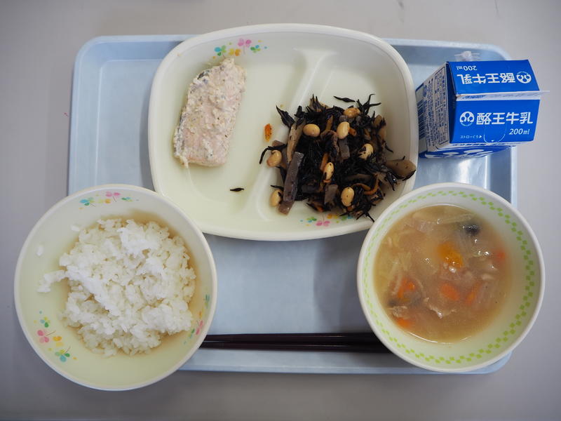 ごはん 牛乳 サケのみそマヨ焼き ひじきの炒め煮 いも団子汁