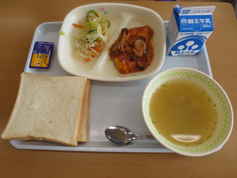食パン 牛乳 オムレツのきのこソースがけ 糸かまサラダ コンソメスープ ブルーベリー&マーガリン