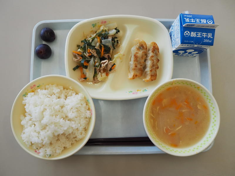 ごはん 牛乳 ギョウザ 五目野菜炒め トックスープ 巨峰